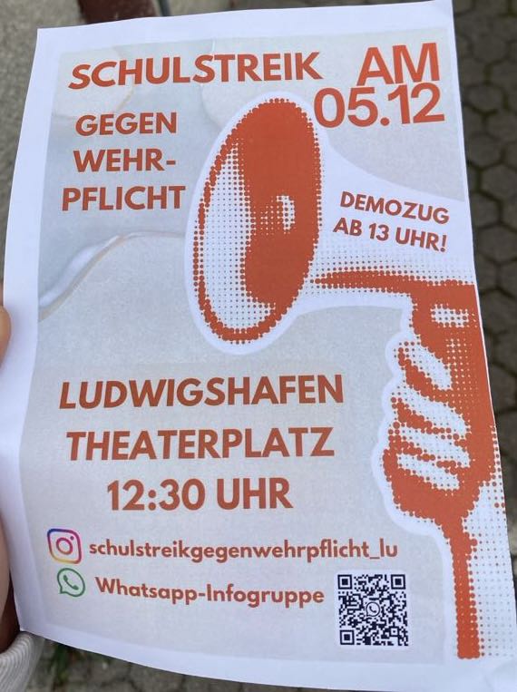 Am 05. Dezember 2025 waren wir mit einer kleinen Gruppe am Theaterplatz in Ludwigshafen am Rhein, um gegen die Wehrpflicht zu streiken. Unser Treffpunkt war um 12:30 Uhr, und um 13:00 Uhr begann der Demonstrationszug.